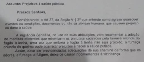 "Embora o fogão a lenha não seja proibido, a fumaça oriundo da queima pode acarretar prejuízos e riscos a saúde pública", frisa o texto.