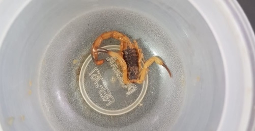 "Esse escorpião amarelo picou uma criança de 11 anos em Campo Mourão. Foi dentro da casa dela, na rua Roberto Brzezinski, perto da perimetral Tancredo Neves. O escorpião estava escondido dentro do tênis. A criança foi medicada e está bem, mas fica o alerta para pais e responsáveis sobre o perigo".