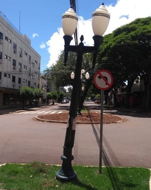 Esquina da av. Manoel Mendes de Camargo com a rua Mato Grosso, no centro de Campo Mourão. A placa diz que é proibido virar à esquerda e o posto republicano, obedientemente, se inclinou para a direita...