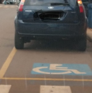 Rua Araruna, em frente ao colégio Santa Cruz, em Campo Mourão. É comum carros pararam com parte sobre a vaga para portadores de deficiência física. Aí não cabe o veículo dirigido por cadeirante. Parece que alguns motoristas pensam que é para uma cadeira de rodas estacionar e não um crro.
