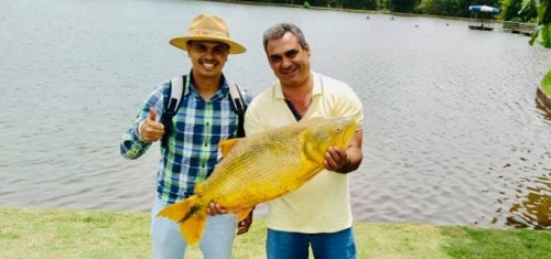 Pesca liberada neste domingo no Parque do Lago de Boa Esperança. E olha só um dos peixes fisgados por lá. Um dourado de cerca de 18 kg. Quem pescou foi um morador chamado Rafael. O prefeito Zé do Caixão foi conferir, com direito a pose para foto. Ah, agora já pode chamar de Zé do Peixão...