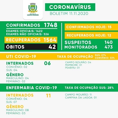 Quinze novos casos de covid-19 foram confirmados nesta quarta-feira em Campo Mourão. Houve 12 recuperados, ou seja, o número de mourãoenses com o vírus ativo voltou a ser 142. A UTI covid ganhou mais um paciente. Agora são seis, quatro pelo SUS (27% de ocupação). O número de casos suspeito subiu de 117 para 140.
