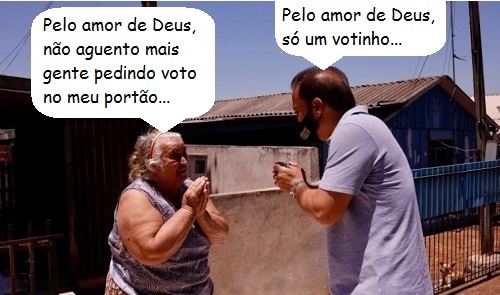 O clic foi publicado em redes sociais do candidato a prefeito de Campo Mourão, Rodrigo Salvadori (PP). Ele conversa com moradora durante visita a bairro da cidade. O balãozinho, claro, é por conta deste Site.