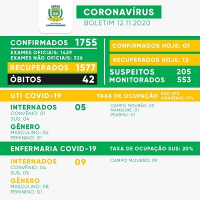 Sete casos de covid-19 foram confirmados nesta quinta-feira em Campo Mourão. Houve 13 recuperados. Assim, o número de mourãoenses com o vírus ativo caiu para 136. A UTI covid está com cinco pacientes, sendo quatro pelo SUS (27% de ocupação). O número de casos suspeitos aumentou bastante, de 140 para 205.