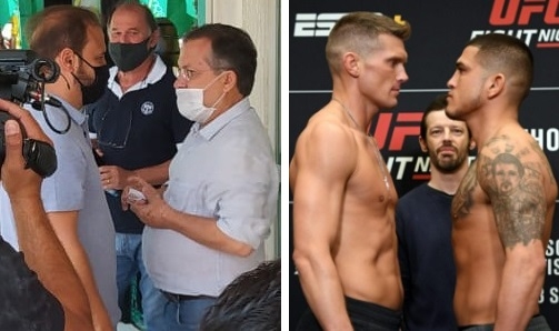 Responda rápido: qual das fotos é uma tradicional encarada pré-duelo de lutadores do UFC e qual mostra o encontro, neste sábado, de dois candidatos a prefeito de Campo Mourão - Rodrigo Salvadori (PP) e Tauillo Tezelli (CDN)? Uma dica: os prefeitáveis se encontraram no centro, durante uma caminhada em busca de votos.