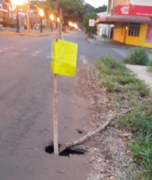 Olha o perigo na av. Jorge Walter, quase esquina com a rua São Paulo. O buraco tem quase meio metro de profundidade.
