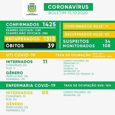 Terça-feira de números ruins no boletim covid. Campo Mourão confirmou mais 11 casos e teve apenas três recuperados. Ou seja: o número de mourãoenses com o vírus ativo subiu de 65 para 73 (era 61 no domingo). Pior: a taxa de ocupação na UTI foi a 73%, com 11 leitos ocupados, sendo seis moradores de Campo Mourão.