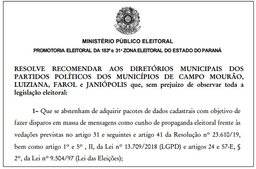 O Ministério Público Eleitoral emitiu recomendação para os partidos polítidos da comarca de Campo Mourão. O que foi pedido? "Que se abstenham de adquirir pacotes de dados cadastrais com objetivo de fazer disparos em massa de mensagens como cunho de propaganda eleitoral".