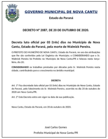 Morreu nesta terça-feira o ex-prefeito de Nova Cantu, Walmick Pereira. Ele era cartorário e administrou o município por dois mandatos - 1973/77 e 1983/88. O prefeito José Carlos Gomes decretou luto oficial por três dias. "Um exemplo de caráter, honestidade e trabalho a ser seguido. Todos cantuenses estamos tristes com sua partida", escreveu o prefeito em rede social.