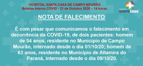 Duas pessoas morreram de covid-19 nesta quarta-feira na Santa Casa de Campo Mourão. Um homem de 63 anos, que morava em Altamira do Paraná, e outro de 54, de Campo Mourão. Foi o segundo óbito de Altamira e o 40.o em Campo Mourão. Em toda a região, 117 pessoas morrem por casua do coronavírus. Dos 25 municípios da região, somente Boa Esperança e Rancho Alegre do Oeste não tiveram óbitos pela doença.