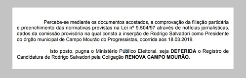 O Ministério Público deu parecer favorável ao registro da candidatura a prefeito de Campo Mourão de Rodrigo Salvadori (PP).