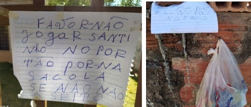 Moradora da rua Jacutinga, no jardim Tropica 2, em Campo Mourão, deixou uma sacolinha no muro e um recado no portão.