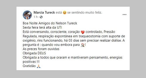 O ex-prefeito de Campo Mourão Nelson Tureck pode deixar a UTI na sexta-feira. A informação foi postada nas redes sociais, nesta quarta-feira à noite, por uma das filhas dele, a ex-secretária da Saúde Marcia Tureck. Segundo ela, Tureck está consciente, conversando, com a pressão regulada e rins funcionando há três dias sem diálise. O ex-prefeito teve complicações da covid-19 e está na UTI em Maringá desde o último dia 12.