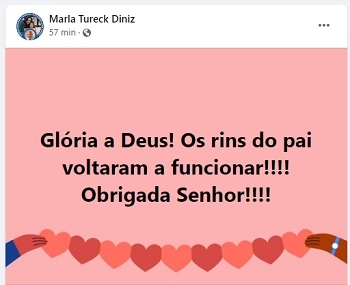 Os rins do ex-prefeito de Campo Mourão, Nelson Tureck, voltaram a funcionar nesta sexta-feira. A informação foi comemorada em rede social por uma das filhas, a ex-deputada Marla Tureck. "Glória a Deus", escreveu ela.