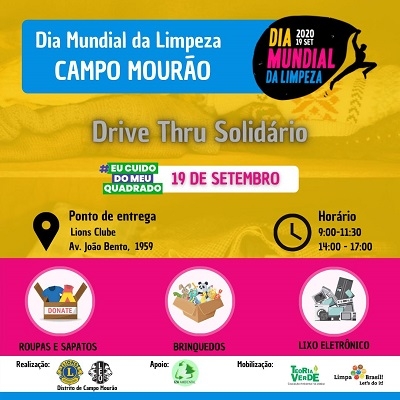 1) Para marcar o Dia Mudial da Limpeza, o Lions de Campo Mourão promove neste sábado o Drive Thru Solidário. O objetivo é arrecadar roupas, calçados, roupas de cama, lixo eletrônico e brinquedos. Será das 9h às 11h30 e das 14h às 17h, em frente ao Sesc.