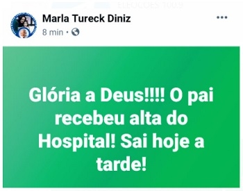 Karla Tureck, ao postar foto do pai, o ex-prefeito Nelson Tureck (Campo Mourão) retornado para casa após receber alta do hospital em Maringá, onde ficou internado por mais de um mês; nesta sexta-feira.