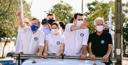 O governador Ratinho Jr esteve em Campo Mourão no final da tarde desta sexta-feira. Desceu de helicóptero no estádio municipal e foi direito para uma carreata do candidato à reeleição Tauillo Tezelli (Cidadania). Antes, ele tinha feito o mesmo em Goioerê, onde apoia Betinho Lima (PSD).