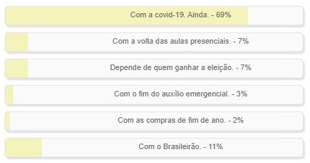 Enquete encerrada neste domingo deu vitória à alternativa da covid-19, com 69% dos votos. Disparada. O "Brasileirão" ficou em segundo lugar, com 11%. "Com a volta das aulas presenciais" e "Depende de quem ganhar a eleição" empataram com 7%. O resultado completo está no quadro acima.