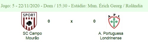 Sport Campo Mourão e Portuguesa Londrinense ficaram no 0 a 0, neste domingo, pela segunda rodada do Campeonato Paranaense da terceira divisão. O jogo foi disputado em Rolândia. O Leão do Vale volta a jogar quarta-feira (15h30), contra o Cambé, outra vez em Rolândia, já que o estádio Roberto Brzezinski não foi liberado.