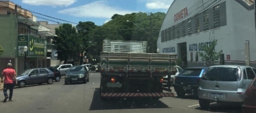 Caminhão para em fila dupla na rua Mato Grosso, centro de Campo Mourão.