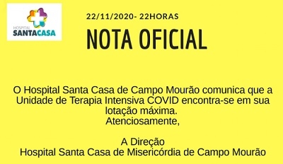 A UTI Covid da Santa Casa de Campo Mourão está com todos os leitos do SUS ocupados. O hospital informou a lotação nas redes sociais por volta das 22h deste domingo. Um pouco antes, o boletim covid da Secretaria da Saúde ainda trazia 66% de ocupação. A unidade está com nove leitos exclusivos para casos de coronavírus. A enfermaria covid também está superlotada.