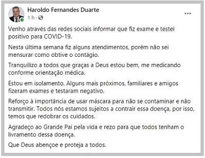 "Tranquilizo a todos que graças a Deus estou bem, me medicando conforme orientação médica", destacou.