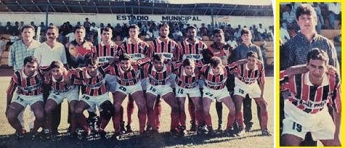 A foto é do Grêmio Farol no Amadorzão de 1997. À esquerda da foto aparece o então prefeito Edson Martins. Agora repare quem está em pé no canto direito. Sim, o prefeito eleito Oclécio Menezes, que era o técnico do time. Detalhe: veja que à frente dele, agachado, está o jogador número 19. E 19 foi o número de Oclécio na eleição deste ano, quando concorreu pelo Podemos. Viu só, tava escrito...