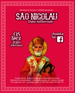 "São Nicolau e o diabo aposentado". Esse é o nome do espetáculo que a Associação Vesná vai apresentar neste sábado (20h30). Por conta da pandemia, será virutal, via Facebook. Vesná é um grupo folclórico ucraniano de Roncador. São Nicolau é o padroeiro ucraniano do município. O espetáculo tem o patrocínio da Coamo.
