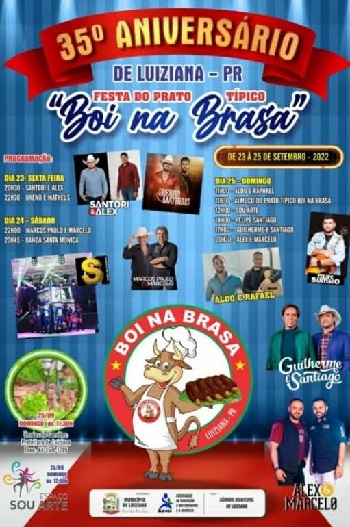 Saiu o cartaz da festa que vai comemorar os 35 anos de emancipação de Luiziana. Será de 23 a 25 de setembro. Serão dois shows na sexta-feira, dois no sábado e quatro no domingo, além da apresentação do Sou Arte. Um dos shows do último dia será com a dupla Guilherme & Santiago. O domingo também terá almoço com a volta do prato típico Boi na Brasa.