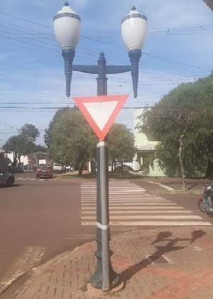 Placa de trânsito amarrada em poste republicano, na rua São Josafat com a av. José Custódio de Oliveira. Foto: QITV