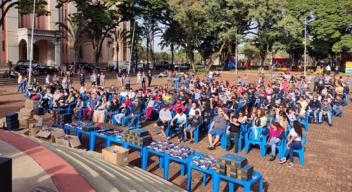 Cerca de 200 crianças e adolescentes, de 7 a 17 anos, receberam no domingo o kit esportivo para treinamento e recreação em sete núcleos esportivos do Campo Mourão Futsal. A entrega aconteceu na praça São José. Foi o lançamento oficial do projeto Formando Campeões, realizado pelo clube desde 2018. Cada kit veio com camiseta, calção, meião, caneleira e tênis.