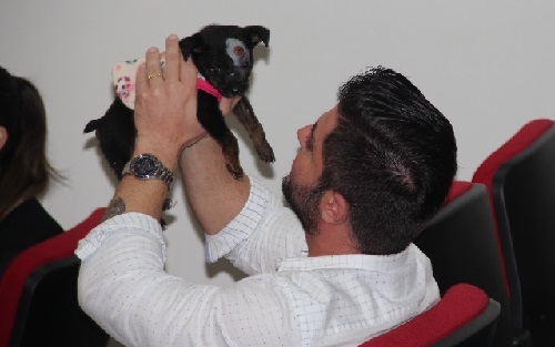 O clic é de sexta-feira, na Comcam, em Campo Mourão, quando uma reunião regional discutiu políticas públicas para a causa animal. O vereador Flávio Mantonvani, que atua nesse "setor", em Maringá, foi um dos presentes. Na foto, ele aparece tentando acalmar um cachorrinho resgatado de maus tratos pela Pais. O bicho não parava de latir e o vereador precisou intervir.