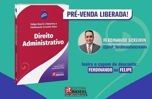 A editora Rideel vai lançar na próxima terça-feira (18h), em São Paulo, a coleção "Amo Direito". São 10 livros do que a editora chama de "maior coleção para concursos do País". E o que é que a gente tem a ver com isso? Tem que uma das obras - "Direito Administrativo" - tem como um dos autores o juiz de direito Ferdinando Scremin Netto, que atua em Campo Mourão. Antes, ele passou pela comarca de Ubiratã. Em tempo: a pré-venda pela internet já está liberada.