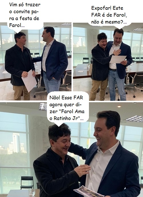 Os cliques são desta quarta-feira, quando o prefeito de Farol, Oclécio Meneses, esteve com o governador Ratinho Jr no Palácio Iguaçu. Aproveitou para entregar um convite para a Expofar, a festa que o município vai realizar de 23 a 25 de junho.