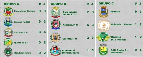 Três jogos serão disputados neste domingo (15h30) pela 3ª Copa Comcam - Grupo ABL. Um deles envolve o 100% Engenheiro Beltrão (três jogos e três vitórias) contra o 0% Quinta do Sol (duas partidas e duas derrotas). Pelo mesmo grupo, Boa Esperança, também com zero ponto, recebe o Goioerê (6). Em Campo Mourão tem Holanda x Roncador. A classificação nos três grupos está no quadro acima.