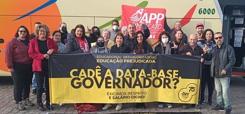 A terça-feira foi dia de protesto de professores da rede estadual de ensino. Houve ato em Curitiba em defesa da data-base. Segundo a APP-Sindicato o governo do Estado está devendo 36% de reposição para o funcionalismo. Este ano, por ser eleitoral, a recomposição das perdas inflacionárias dos últimos 12 meses deve ser feita até 1° de julho. Daí o motivo da pressão no momento. Um grupo de profissionais da educação de Campo Mourão marcou presença em Curitiba.