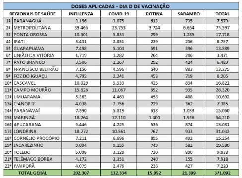Juntos, os 25 municipios da região de Campo Mourão aplicaram 28.320 doses de vacina no Dia D da Vacinação, realizado no sábado. Foram 15.626 doses contra a gripe e 11.067 contra a covid-19, além das vacinas de rotina e contra o sarampo. A 11ª Regional de Saúde foi a quarta que mais vacinou. Só foi superada pelas "grandonas" - Região Metropolitana de Curitiba, com 73.597; Maringá, com 34.210, e Londrina, com 31.033.