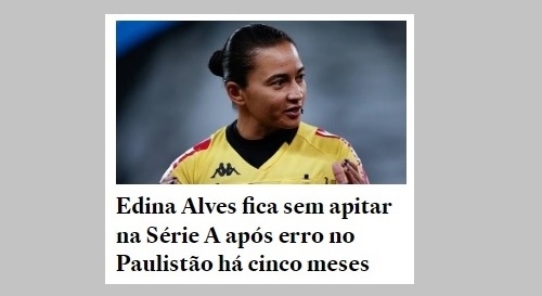 A árbitra Edina Alves, de Goioerê, foi destaque na mídia nesta sexta-feira. O motivo agora é a ausência dela em jogos do Brasileirão Série A. Não apitou nenhum em 2022. Reportagem do "Estadão" diz que ela foi colocada na "geladeira" após erros no clássico entre Santos e São Paulo, pelo Paulistão. Já são cinco meses! Edina tem atuado na Série B. Nesta sexta-feira, por exemplo, apita Cruzeiro x Vila Nova, no Mineirão.