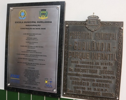 Não foi só a tartaruga que foi levada da velha para a nova Escola Gurilândia, em Campo Mourão, não. A placa da primeira inauguração também. Ela registra o ato de 10 de outubro de 1970. A placa de bronze, aliás, é bem completa: diz que a obra foi iniciada na gestão do prefeito Augustinho Vecchi (primeiro dos três mandatos dele) e concluída e inaugurada pelo prefeito Horácio Amaral.