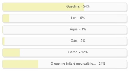 "Qual preço vem te irritando mais?" Enquete com esta pergunta foi encerrada neste domingo. A gasolina venceu "no primeiro turno", com 54% dos votos. "O que mais me irrita é o meu salário" acabou em segundo, com 24%, seguido da carne, com 12%. O resultado completo está no quadro acima.