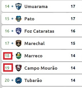 Faltando cinco rodadas para o fim da primeira fase, Campo Mourão tem "decisão" nesta sexta-feira (21h) na briga por uma vaga no G-16 que avança para o mata-mata. Será contra o Marreco, em Francisco Beltrão. Os dois times têm 14 pontos e precisam da vitória. O Carneirão é 19° colocado e o Marreco 18° pelos critérios de desempate. Os mourãoenses vêm de vitória por 5 a 2 no Taubaté/SP, mas o time do sudoeste aplicou goleada ainda maior - 8 a 1 no Marechal.