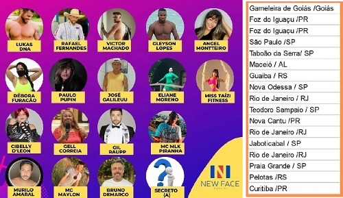 A organização do New Face Reality Brasil já divulgou a relação de 17 dos 18 participantes do reality show que será realizado em Campo Mourão. O 18° é segredo. A lista tem apenas um nome da região, que é de Nova Cantu. Os demais vêm de outras 13 cidadades de cinco estados. Do Paraná tem mais dois de Foz do Iguaçu e um de Curitiba.
