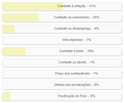 "O que os presidenciáveis deveriam prioriozar como compromisso de campanha?" Enquete foi encerrada neste domingo. Ganhou o "combate à inflação", com 41% dos votos. Em segundo ficou o combate ao... "comunismo", com 25%. O "combate à fome" teve 16%. Polêmicas como voto impresso e aborto não passaram de 1%. O resultado completo está no quadro acima.