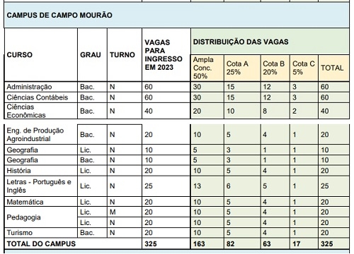 A Unespar abre nesta terça-feira as inscrições para o vestibular 2023. O prazo vai até 3 de outubro, com provas marcadas para 6 de novembro. A taxa de inscrição custa R$ 100. No total são mais de 1.900 vagas em sete câmpus. Em Campo Mourão são 325 vagas em 10 cursos. Metadedas vagas é por ampla concorrência e metade por cotas.