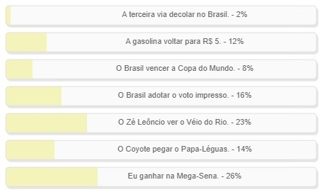 Enquete com esta pergunta foi encerrada neste domingo teve vitória da alternativa "Eu ganhar na Mega-Sena", com 26% dos votos. "Zé Leôncio ver o Véio do Rio" ficou em segundo, com 23%. Já "O Brasil adotar o voto impresso" teve 16%. O resultado completo está no quadro acima.