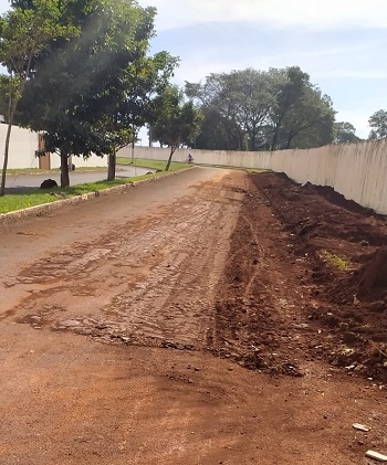 Foi feito encanamento e a terra ficou na rua. Isto ao lado da construção do centro de eventos no Parque de Exposições de Campo Mourão. Já imaginou se chove...