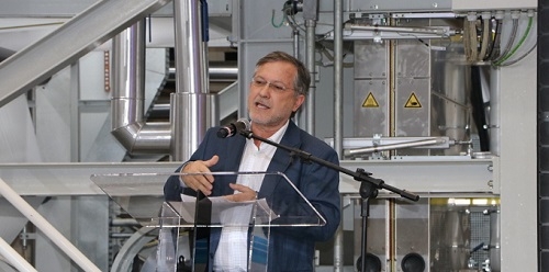 Tauillo Tezelli (Cidadania), prefeito de Campo Mourão, ao discursar na inauguração da nova laminadora da Colacril; nesta terça-feira. Só a máquina, de fabricação alemã, tem 82 metros de comprimento.