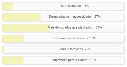 "Na sua cidade, como são/estão as árvores públicas?" Enquete foi encerrada neste domingo. Venceu a alternativa "Mais derrubadas que plantadas", com 33% dos votos. "Derrubabas sem necessidade" teve 27%. Para 15% as árvores estão "Correndo risco de cair" e para outros 15% são "impróprias para a cidade". O resultado completo está no quadro acima.