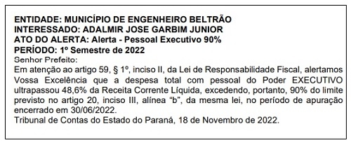O Tribunal de Contas do Estado publicou nesta terça-feira dois alertas para a prefeitura.