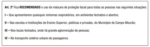 Saiu nesta terça-feira o decreto do prefeito Tauillo Tezelli que trata do uso de máscaras para o combate à covid-19 em Campo Mourão. Obrigação só em espaços de saúde. Já a recomendação vale para todo mundo que tiver qualquer sintoma respiratório, em escolas e faculdades, em locais fechados com aglomeração de pessoas e no transporte coletivo.